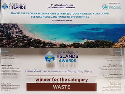 At the annual meeting of the organisation Greening The Islands, held on 19 October 2019 in Palermo, Sicily, the Municipality of Naxos was awarded in the "Waste" category for the "Green Kiosk" initiative, developed under the PAVEtheWAySTE program, concerning the installation and operation of four recycling units in Small Cyclades. The system has been adapted to meet the local area’s needs and to produce high quality recyclable materials. The GTI global index constitutes a new way of evaluating the progress islands around the world are making over the environmental actions carried out by them.